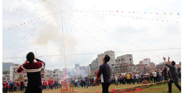 每年正月十六是广西岑溪市三堡太平庙传统的民间体育活动抢花炮的日子.这天,三堡附近村落的群众便会聚集到太平庙,举办一年一度的抢花炮活动